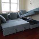 - Sofa boleh ditarik balik adalah padatLagipun, apabila dilipat, ia memerlukan sedikit ruang. Ia boleh diletakkan tepat di sebelah almari, dinding atau ditarik ke niche. Dibentangkan, perabot dengan cepat menjadi katil yang luas dan selesa.