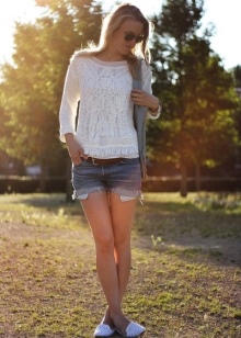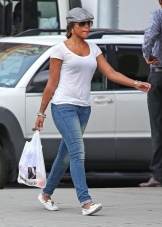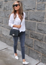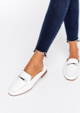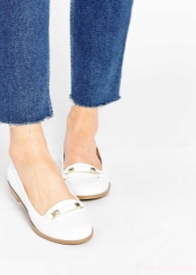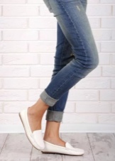 Tunduk bandar suka seluar jeans yang akan menjadi baik dengan moccasin putih, tanpa mengira gaya dan potongan kedua-duanya. Untuk membuat wajah santai, anda boleh menggunakan seluar jeans kurus ringan dengan gabungan model klasik kasut ini, serta kemeja-t dengan cetakan atau corak cerah.