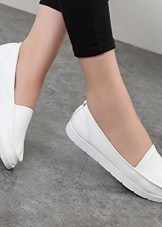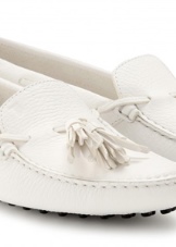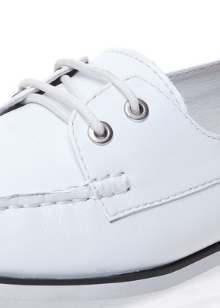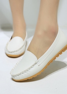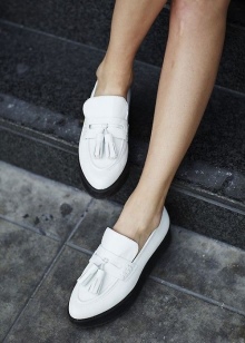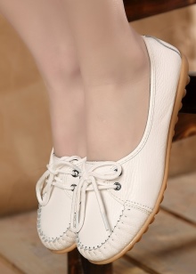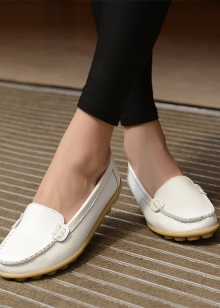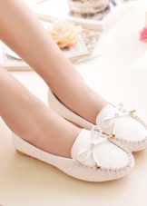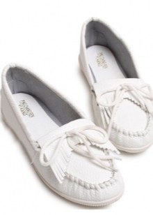 Sepatu getah yang fleksibel bagi produk tersebut tidak akan membenarkan kaki wanita lelah walaupun semasa berjalan kaki panjang, dan oleh itu kasut itu dianggap sebagai pilihan terbaik untuk dipakai sehari-hari. Warna putih dalam kes ini adalah salah satu kelebihan kasut seperti itu, kerana ia adalah yang paling serba boleh dan pada masa yang sama kelihatan untuk mengimbangi kesederhanaan model klasik moccasin.