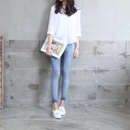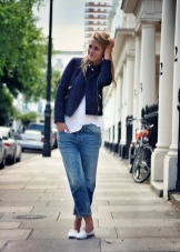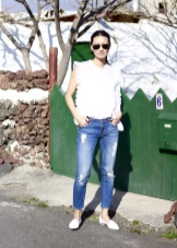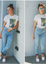 Gaya yang lebih feminin akan membantu membuat seluar jeans ketat di pinggang tinggi dengan moccasins platform putih. Sebagai bahagian atas, anda boleh menggunakan blaus rajutan dengan bahu kosong atau garis leher yang dalam, pelbagai puncak atau baju yang diselipkan ke seluar jeans.