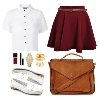 Ia boleh menjadi skirt bel atau trapeze dengan panjang di atas garis lutut.Sebagai bahagian atas, anda boleh menggunakan segala-galanya yang tidak tergolong dalam gaya rasmi atau perniagaan yang elegan: baju kaos, turtleneck, kemeja-T, top atau baju dengan cetakan rumit.