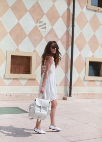 Moccasin kulit putih boleh menjadi hiasan yang layak pada penampilan musim panas, yang terdiri daripada sundress panjang maxi cahaya dengan siluet yang dipasang dan skirt ringan yang besar. Cengkaman kecil pada tali yang panjang dan ikat kepala ikat akan mampu menyempurnakan busur ini secukupnya.