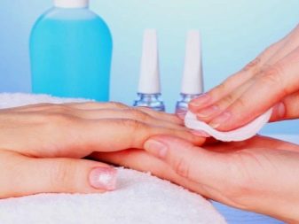 Pertama, buang tangan, basuh dengan sabun cecair. Seterusnya, mereka disapu kering dengan tuala. Dengan bantuan aseton mereka menghilangkan lapisan lama. Lebih baik menggunakan cecair yang mengandungi minyak atau nutrien penting. Sekiranya terdapat varnis hibrid pada kuku, ia akan dikeluarkan menggunakan cecair khas.