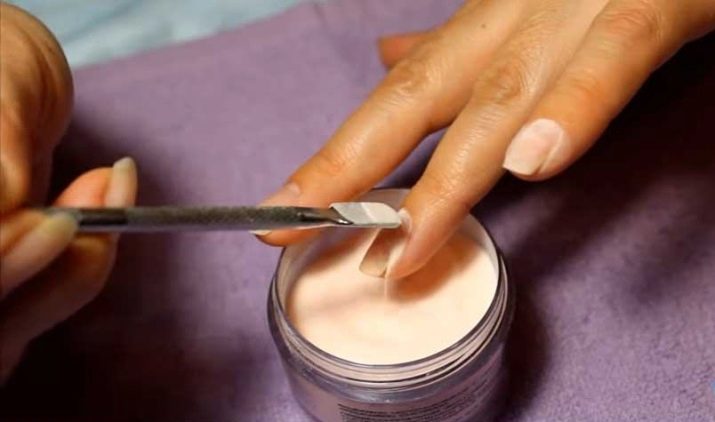 Anda boleh menguatkan kuku dengan cara lain. Untuk melakukan ini, pertama anda perlu melakukan penjagaan kecantikan, menjajarkan panjang, membuat pinggir pada sepuluh kuku sama, bersihkan kutikula dan pterygium. Selepas mengisar pada kuku, anda perlu memohon primer dan mengeringkannya, kerana kekurangan pengeringan akan menyebabkan detasmen cepat apa-apa bahan. Selepas itu, monomer digunakan pada plat kuku, mengambil penolak di tangan mereka, mereka mengumpul serbuk akrilik di atasnya dan taburkan piring kuku mereka.