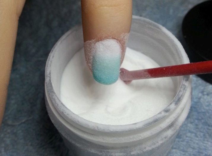 Taburkan dengan murah hati tanpa menyentuh atau menggosok bubuk ke permukaan kuku. Ia adalah perlu untuk mengambil serbuk telus untuk pengukuhan. Untuk menyimpan serbuk, anda perlu memegang kuku di atas balang serbuk. Sebaik sahaja kuku dibasuh dengan serbuk, ia segera dikeringkan dalam lampu. Masa pempolimeran bergantung kepada jenis lampu dan boleh dari 1 hingga 2 minit.