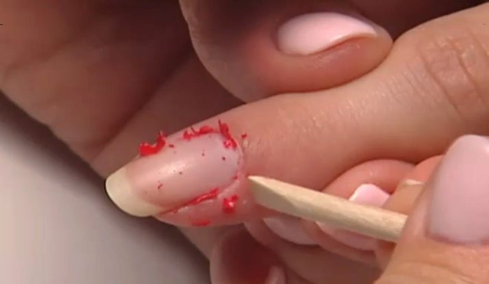 Mengeluarkan akrilik adalah mudah.Tidak perlu merobek apa-apa, kerana ini akan membahayakan kuku anda. Untuk mengeluarkan lapisan akrilik, cukup untuk menggunakan cecair khas di mana kuku direndam selama kira-kira 15 minit. Selepas masa yang diperlukan, salutan dikeluarkan dengan batang oren. Sebagai peraturan, bahan larut akrilik dengan baik, jadi selepas 15 minit ia dikeluarkan tanpa banyak usaha.