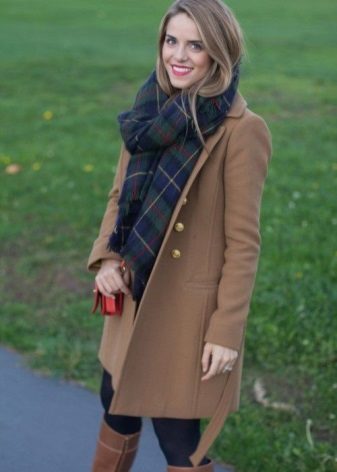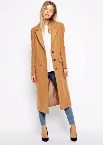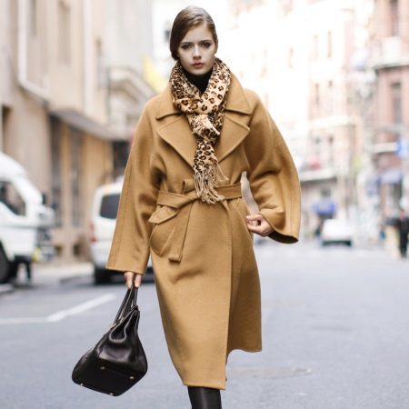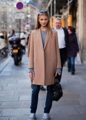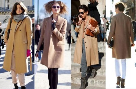 Kot kot unta sangat mudah untuk digabungkan dengan pakaian gaya dan warna yang berbeza. Di bawahnya, anda boleh memakai pakaian elegan dengan kasut dan seluar jeans yang dibuli dengan bulu buku lali.