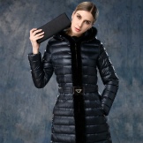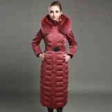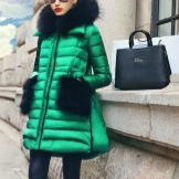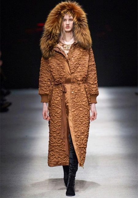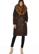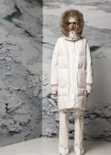 - Jaket turun tidak harus dielakkan kerana pendapat umum yang mereka tambah jumlahnya. Perkara utama adalah untuk mencari panjang anda, kot bawah tidak boleh berakhir di atas bahagian atas paha, dan kolar bulu akan menukar penekanan dari bahagian bawah angka ke atas.