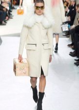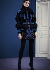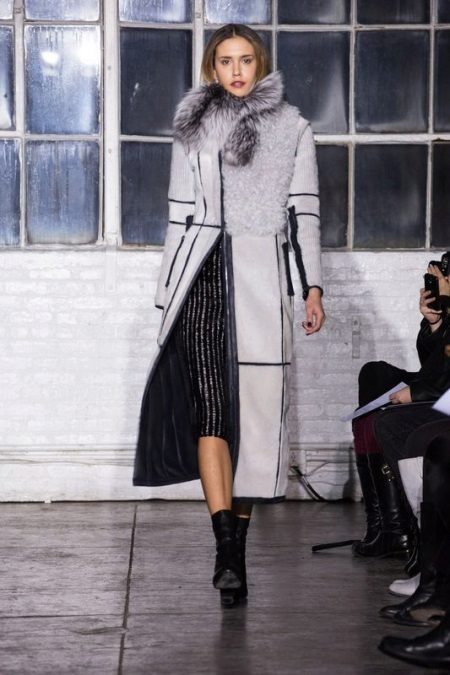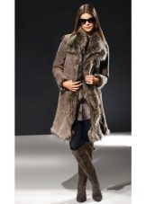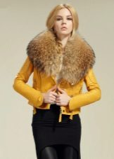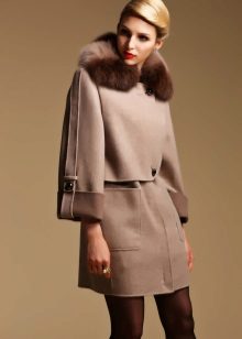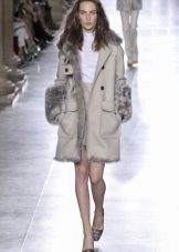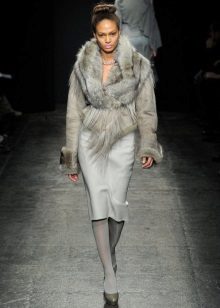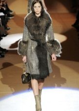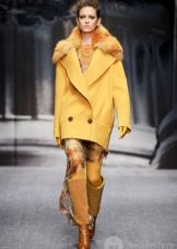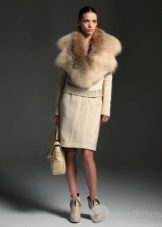 - Warna-warna kuning muda dan kelabu yang mulia digabungkan sepenuhnya dengan bulu warna semula jadi. Kotak beige dengan kerah lynx kelihatan sangat elegan.