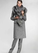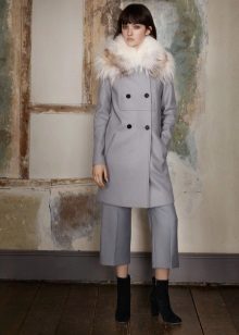 - Lapisan jurulatih kelabu muda dalam lurus lurus dengan kolar bulu yang sesuai adalah sentuhan kasual yang elegan.