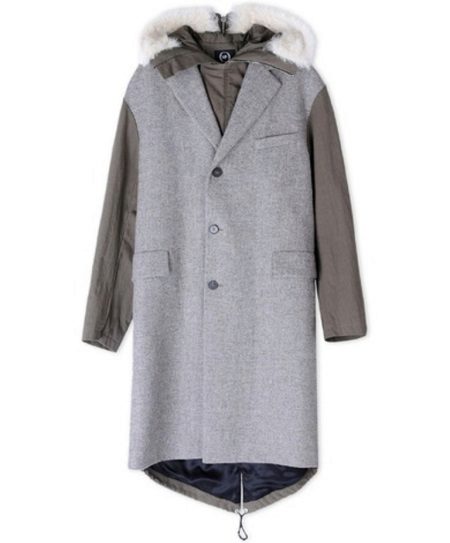 - Alexander McQueen - mantel gabungan laconic dengan tudung bulu.