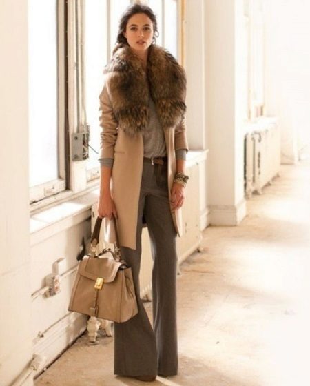 - Pakai seluar panjang lurus dengan mantel lurus dengan kolar bulu yang kemas, beg sepadan dan kasut bertumit tinggi.