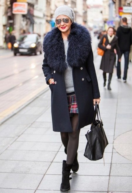 - Sebuah tudung navy lurus dengan kerah bulu besar meminta skirt dan baju nipis. But rendah, beg dan topi kelabu - busur anda sudah siap!