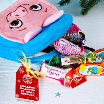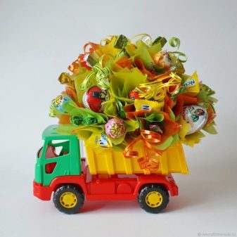 Sesuatu yang serupa kadangkala dijual di kedai - nampaknya terdapat hadiah tradisional, dalam bentuk satu set coklat, tetapi dibungkus dalam kotak kreatif. Oleh itu, walaupun mainan boleh bertindak, sebagai contoh, trak dengan badan pembukaan, yang dipenuhi dengan gula-gula. Satu lagi penyelesaian yang serupa ialah ransel haiwan, yang juga dijual bersama dengan gula-gula di dalamnya.