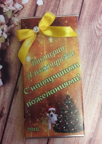 Di kedai biasa, ini tidak dijual, tetapi coklat nominal, yang boleh dijumpai di Internet, boleh menjadi versi persembahan yang ingin tahu. Anda mungkin menyaksikan botol Coca-Cola yang serupa, tetapi ia dianggap terlalu kental kerana dijual di mana-mana. Perkara yang sama sekali berbeza - bar coklat, kerana nama penerima boleh digunakan dalam surat keriting di atasnya sendiri, dan bukan hanya pada labelnya.