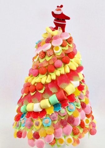 Penyelesaian yang paling jelas ialah ciri siluet merapikan sebagai simbol percutian yang akan datang, Ia pada masa yang sama dan tidak berbeza dalam konfigurasi yang sukar. Jika hadiah dibuat untuk seorang gadis, gula-gula boleh diatur dalam bentuk sejambak - seorang wanita selalu gembira menerima bunga, tetapi mereka biasanya tidak dibentangkan dengan bunga untuk Tahun Baru, dan kemudian mengejutkan seperti itu.