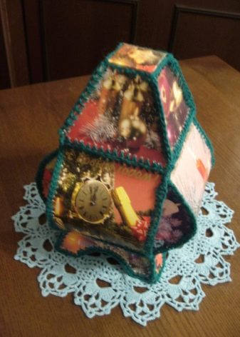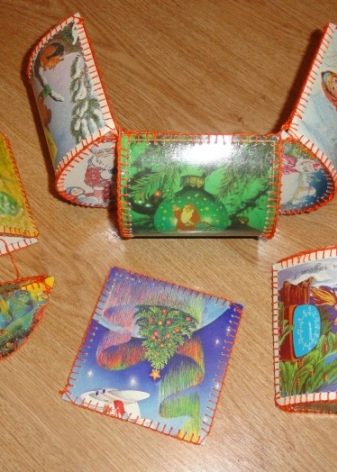 Bahan untuk itu, bagaimanapun, memerlukan satu yang unik - ia akan mengambil beberapa kad Tahun Baru untuk membuatnya, dan prioritas diberikan kepada penerbitan lama, yang biasanya memiliki warna yang lebih terang meskipun warna pudar mereka. Anda boleh menyambungkan dinding individu kotak depan dalam apa-apa cara yang mudah untuk anda, jika hanya ia akan menjadi cantik.