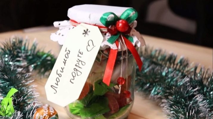 Apa yang anda perlukan adalah untuk mengambil balang yang indah dari setiap kelantangan yang dikehendaki, isikan dengan gula-gula kecil ke bahagian atas dan tutup penutup, seperti pemeliharaan sebenar. Dari jauh, hanya pembalut gula-gula yang berkilat akan kelihatan, dan penerima tidak akan segera memahami apa itu. Hidangan, tentu saja, harus dihiasi lebih lanjut - untuk ini, tinsel terpaku dengan pita.