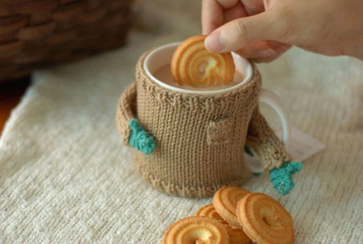 Sweater pada cawan kegemarannya - Ia cukup sesuai dan anda boleh menemui banyak idea sedemikian. Terdapat baju sejuk dengan leher dan lengan, dan ada selendang; perkara utama adalah bahawa mereka sesuai dengan saiz gelas atau cawan dan duduk dengan baik pada mereka.
