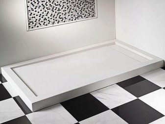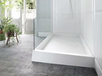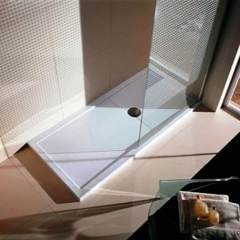 Dulang pancuran rendah termasuk sampel sehingga 10 cm tinggi (biasanya 5-7 cm). Tambahan utama model sedemikian ialah mereka kelihatan hebat dengan mandi. Di samping itu, dalam model yang rendah tidak perlu melangkah ke tahap yang tinggi - itulah sebabnya pilihan tersebut dipilih untuk orang tua atau orang kurang upaya. Palet seperti itu dibina terus ke lantai, yang memaksa mereka untuk merancang pemasangan mereka semasa pembaikan premis.
