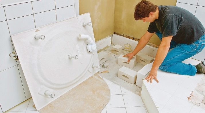 - Pemasangan. Sangat penting untuk menentukan pilihan pemasangan apabila memilih pallet. Selesaikan dengan unit yang mendalam biasanya skrin khas atau kaki dengan pelarasan ketinggian - ini sangat memudahkan proses pemasangan. Dalam model yang rendah, tidak terdapat unsur-unsur seperti dalam kit, oleh itu pemiliknya sering memasang pemasangan atau podium untuk pallet secara berasingan.