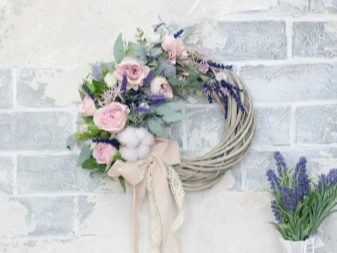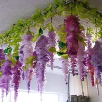 Keputusan yang menarik adalah untuk mencairkan bunga dengan reben dengan kelopak individu atau untuk memasang hiasan tidak langsung ke dinding, tetapi di sebelahnya di bawah siling menggunakan tali.