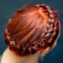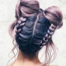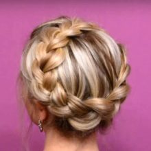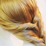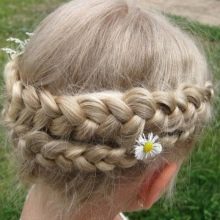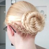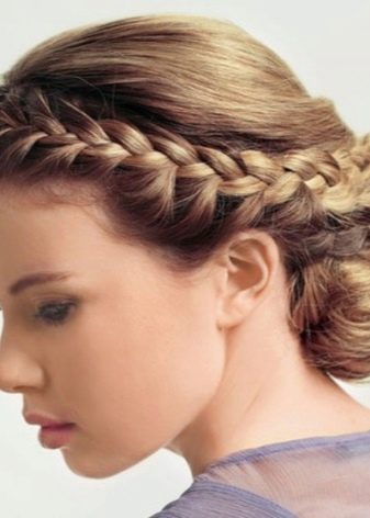 - Dengan membuat dua pigtail pendek di kedua-dua belah pihak, salah seorang daripada mereka mesti diletakkan di sekitar kepala di atas dahi. Yang kedua membentang berdekatan, tetapi melalui belakang kepala. Boleh diperbaiki pada kancing dan tidak kelihatan.