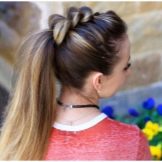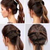 - Untuk gaya rambut seterusnya, anda perlu membuat tiga ekor kuda ekor yang sama, yang akan ditempatkan dengan ketat di tengah kepala, satu demi satu (ke arah: mahkota - belakang kepala). Kemudian, secara beransur-ansur, ekor ternyata melalui diri mereka supaya hujungnya dapat diselipkan ke "gelung" ekor seterusnya. Ternyata pilihan yang menarik ekor rendah biasa, yang pasti menarik perhatian orang lain.