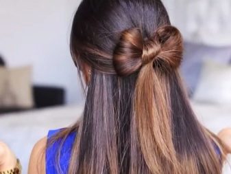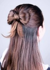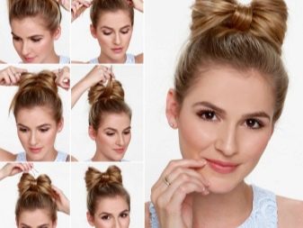 - Busur kemas boleh didapati dalam masa 2 minit sahaja. Untuk melakukan ini, anda perlu mengumpul rambut di ekor kuda. Tetapi pada giliran terakhir dengan jalur elastik untuk meregangkan keriting tidak sepenuhnya. Oleh itu, keriting akan dibahagikan kepada dua bahagian yang sama. Mereka bergerak berasingan dan tetap tidak kelihatan. Hujung yang kekal dari ekor akan menutup tengah busur. Untuk melakukan ini, dia mengetuk dan mengikat.