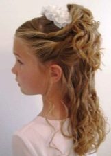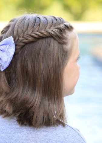 Kanak-kanak sekolah rendah mungkin suka keriting longgar di atas sebuah persegi dengan perpisahan zigzag. Ekor rapi di tepi dan dihiasi dengan busur putih akan membantu membuka muka anda dan menangguhkan cincin nakal. Jika panjangnya membolehkan, maka anda boleh mengikat kancing Perancis (atau belakang) dari dahi ke rantau temporal. Curls pendek lurus akan kelihatan hebat di bahagian "spikelet". Ia berbeza dari yang klasik di mana kunci tidak ditenun menjadi kuncir, tetapi tetap dibubarkan.