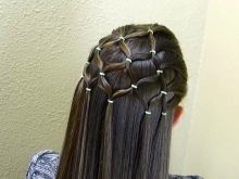 Berlian - ini adalah pilihan asal untuk keriting longgar. Ideal untuk pelajar sekolah rendah. Sebagai permulaan, beberapa ekor kuda kecil dibuat daripada perpisahan langsung di sisi. Kemudian setiap ekor kuda dibahagikan kepada dua bahagian, dan masing-masing disambungkan ke kunci dari ekor kuda yang lain. Ternyata semacam "air terjun". Dengan gaya ini, anda boleh mengeluarkan rambut dari depan muka, yang, sebagai peraturan, mengganggu penulisan dan membaca.