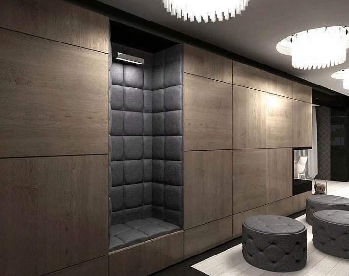 Di lorong anda boleh meletakkan kerusi dengan kerusi yang keras dan lembut, pilihan bergantung pada pilihan peribadi. Jika dikehendaki, najis dibekalkan dengan bantal lembut yang boleh ditanggalkan, penutup kainnya dipilih untuk palet warna umum bilik. Sekiranya lorong itu mempunyai pedalaman monokrom, maka kerusi sedemikian boleh menjadi aksen yang terang, mengisi ruang dengan sebaliknya. Apabila memilih jenis bangku lembut, perhatian harus diberikan kepada kualiti upholsteri: