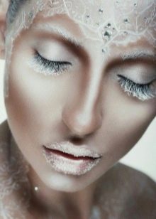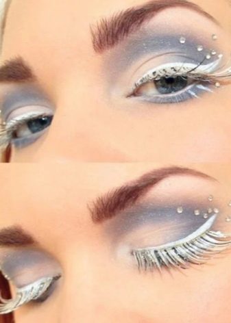 - Trend fesyen sangat bagus untuk mencipta solek percutian, terutamanya untuk merayakan Tahun Baru atau perayaan musim sejuk yang lain. Warna cahaya digunakan secara aktif untuk membuat solek pada musim sejuk. Warna putih pada bulu mata dikaitkan dengan salji dan hoarfrost. Anda boleh melengkapkan imej dengan rhinestones dan berkilau yang akan bersinar secara terang-terangan di hujung bulu mata.