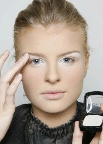 Pilihan kedua untuk bulu mata warna tanpa risiko bagi mereka adalah penggunaan bayang-bayang salji putih. Anda boleh menggunakan komposisi matte atau melapisi rambut dengan kilau halus (berkilau). Seperti pilihan yang dinyatakan di atas, kaedah sedemikian memberikan kesan jangka pendek.