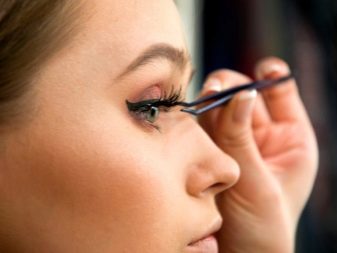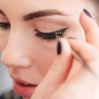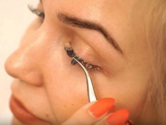 Sebelum menetapkan bulu mata dengan gam, disyorkan untuk "cuba" mereka. Untuk melakukan ini, rasuk dikeluarkan dengan pinset dari pakej, selepas itu ia mesti digunakan di tempat yang dipilih dan menilai sama ada ia kelihatan harmonis.