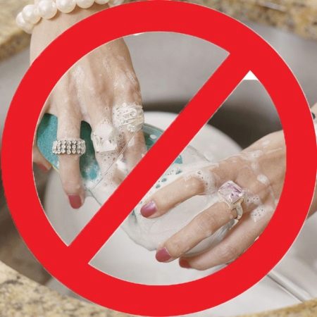 Lapisan rhodium dimusnahkan oleh tindakan detergen dengan komposisi agresif - serbuk pembasuhan, gel pencuci pinggan, dll. Sebelum membasuh tangan dan mencuci pinggan, disyorkan untuk mengeluarkan cincin dan gelang yang dipakai.. Perhiasan juga boleh merosot dari kenalan dengan alkoholOleh itu, interaksi mereka dengan semua sebatian yang mengandungi alkohol tidak dibenarkan.