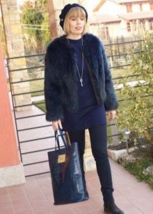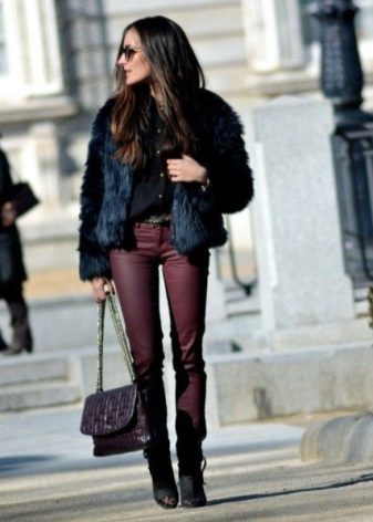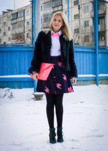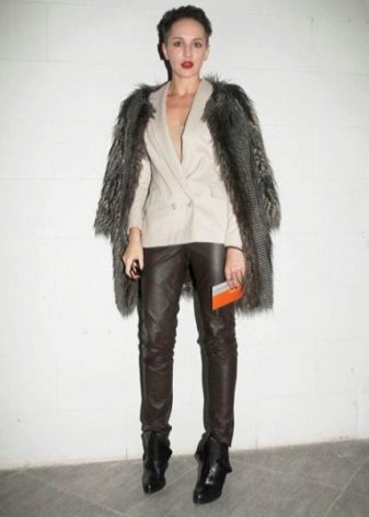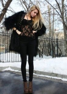 Anda boleh melihat rupa perniagaan yang bergaya jika anda meletakkan kot bulu di atas baju hitam yang terletak di bawah seluar hitam ke dalam sangkar kecil. Aksesori akan menamatkan imej - tali pinggang kulit pada seluar dan manik besar.
