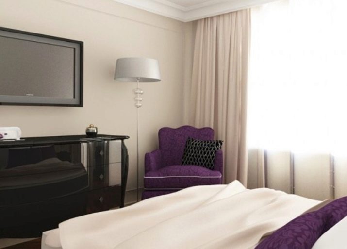 Dalam bilik tidur bergaya yang selesa yang dibuat dalam warna susu, anda tidak boleh melakukan tanpa aksen yang terang. Ini mungkin termasuk bantal ungu di atas katil putih, berdiri TV berwarna gelap dengan kaca kaca, serta kerusi lengan tunggal ungu yang menghadap katil di sudut.
