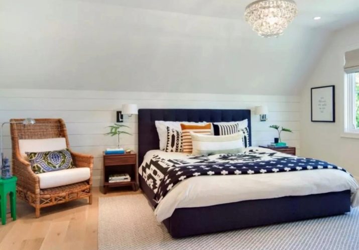 Reka bentuk yang menarik akan berubah jika anda meletakkan katil lembut berwarna biru gelap di dalam bilik tidur putih dengan kepala katil yang tinggi, kerusi rias, meja tepi katil kayu kecil, serta kerusi rotan yang dibuat dari ranting, dilengkapi dengan lapisan lembut di tempat duduk. Yang terakhir boleh diletakkan di sudut atau sedikit lebih jauh daripada satu meja di tepi katil.