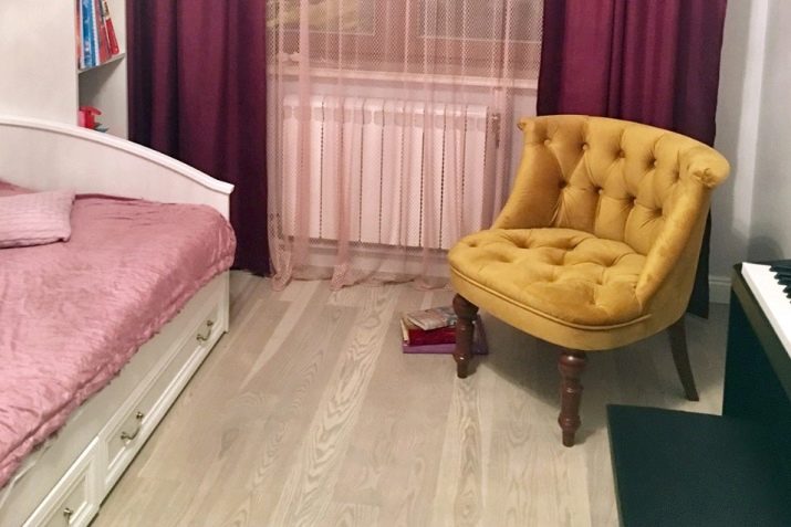 Kerusi boudoir emas akan kelihatan cantik di bilik tidur seorang gadis, dibuat dengan warna merah jambu dan ungu.