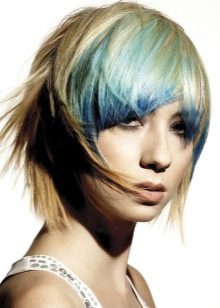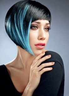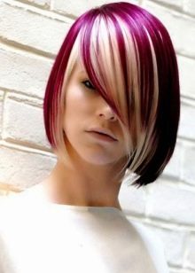 Jika anda mempunyai kacang asimetrik, maka anda harus memberi keutamaan kepada peralihan kontras. Dalam kes ini, anda boleh menghiasi hujung helai cahaya pada poni dengan benar-benar apa-apa warna - biru, merah jambu dan juga ungu.
