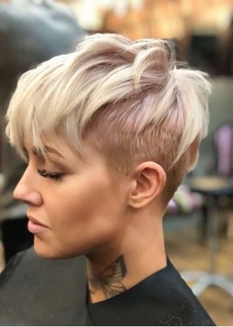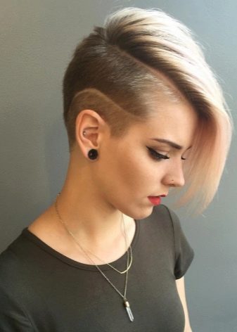 Dengan kuil yang dicukur - Sekilas pandang, potongan rambut seperti menyerupai anak muda yang menjadi penganut salah satu subkultur biasa, tetapi ini tidak perlu sama sekali, kadang-kadang potongan rambut ini dilakukan oleh wanita yang berusaha untuk melihat luar biasa dan menarik perhatian lelaki. Bagaimanapun, gaya rambut ini semestinya sepadan dengan watak - mereka hanya sesuai untuk wanita yang berani, kuat dan kuat.