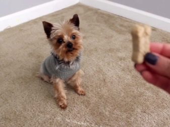 - "Lie down". Pertama menunjukkan anjing merawat lazat, dan kemudian menurunkan tangan anda dan menerajui ke hadapan. Apabila York cuba mengeluarkannya, berikan arahan ini dan, setelah menunggu pelaksanaannya, beri hadiah kepada anjing.