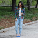 Kasut baji biru mengharmonikan dengan baik dengan seluar jeans scuffed dan hitam dan putih atas untuk membuat penampilan yang menarik, musim panas.