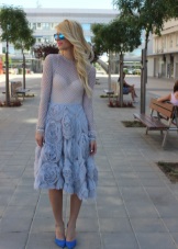 Untuk melihat pintar, berikan keutamaan kepada kasut suede dalam warna biru terang. Mereka akan menjadi aksen imej yang unik dan menarik. Kasut boleh digabungkan secara selamat dengan pakaian sarung satin atau renda.