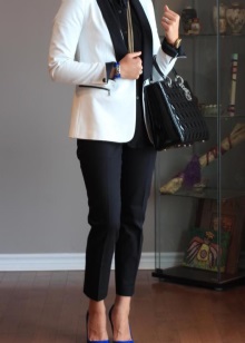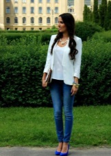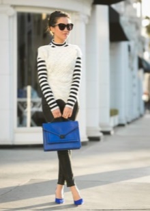 Kasut suede biru dengan seluar salji putih kelihatan elegan dan bergaya. Apabila memilih bahagian atas, anda boleh memberi pilihan kepada blaus atau baju biru, biru atau biru.