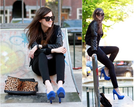 Kasut dengan tumit yang selesa dari teduh biru gelap sesuai untuk tunduk. Untuk perwujudan gaya musim panas yang bergaya setiap hari, kasut warna biru muda akan menjadi pilihan yang sangat baik. Kemuncak pakaian perayaan akan menjadi stilettos warna neon-biru.