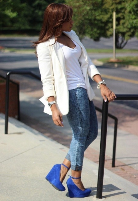 - Pada baji - kasut adalah mudah dan selesa, kerana kawasan sokongan lebih besar daripada tumit. Kasut suede baji biru sering digabungkan dengan pakaian untuk membuat penampilan kasual.