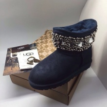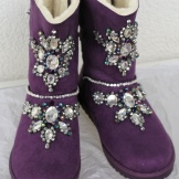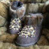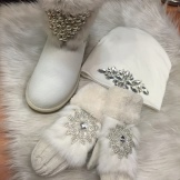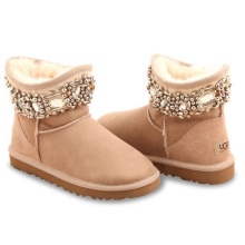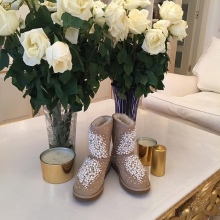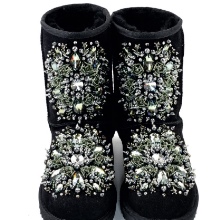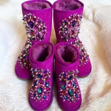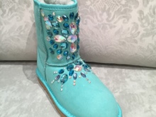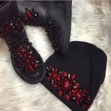 Butang ugg mewah bersulam dengan kristal Swarovski sangat popular. Batu-batu berkilat boleh membentuk corak atau perhiasan yang indah, atau mereka boleh menutup seluruh but, memberikan kilauan indah.