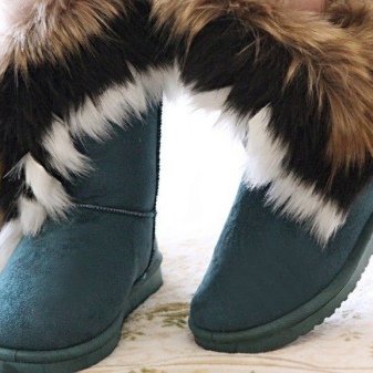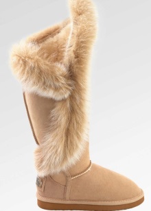 Butang kasut asal adalah simbiosis ugg dan but tinggi. Mereka semua sama selesa dan lembut, tetapi pada masa yang sama bulu halus di bahagian atas tidak membolehkan anda pergi tanpa disedari. Di samping itu, kelebihan bulu memainkan bukan sahaja perhiasan hiasan - bulu halus akan melindungi kaki anda dari sejuk, walaupun dalam fros yang teruk.